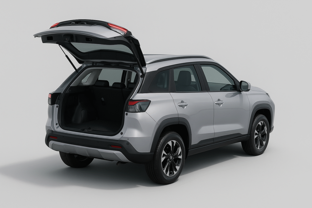 Maruti Suzuki Victoris SUV with Powered Tailgate open, rear-side view showcasing premium SUV design.